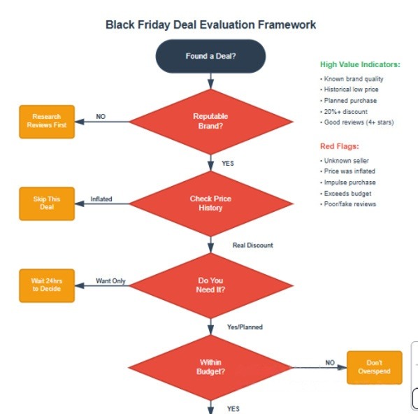This flowchart provides a systematic, data-driven approach to evaluating Black Friday deals. The framework guides shoppers through five critical decision points, incorporating relevant statistics that reflect actual consumer behavior and market realities.