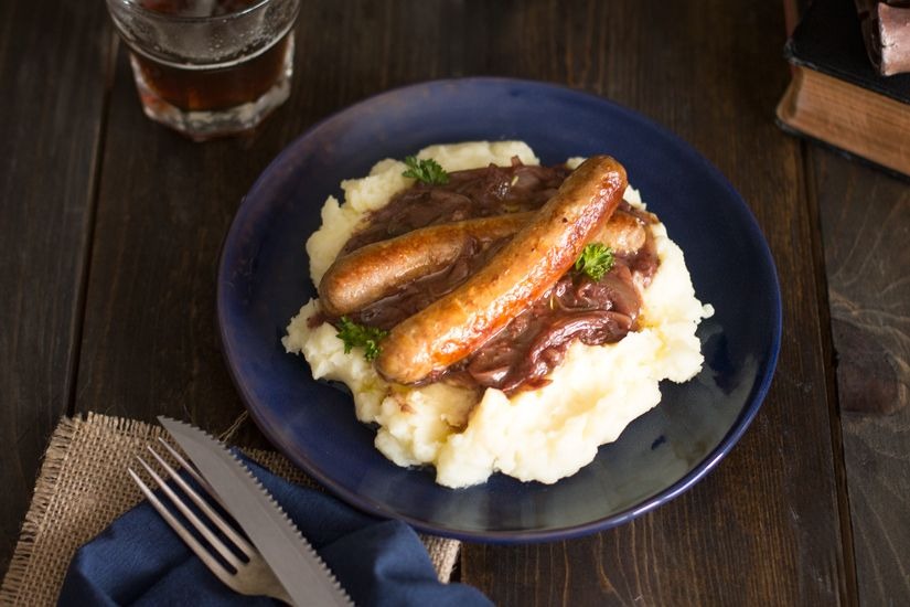 Bangers means sausages (the name supposedly comes from the sound they made bursting in the pan during wartime). Served with creamy mashed potatoes and onion gravy, this simple combination appears on pub menus across the UK.